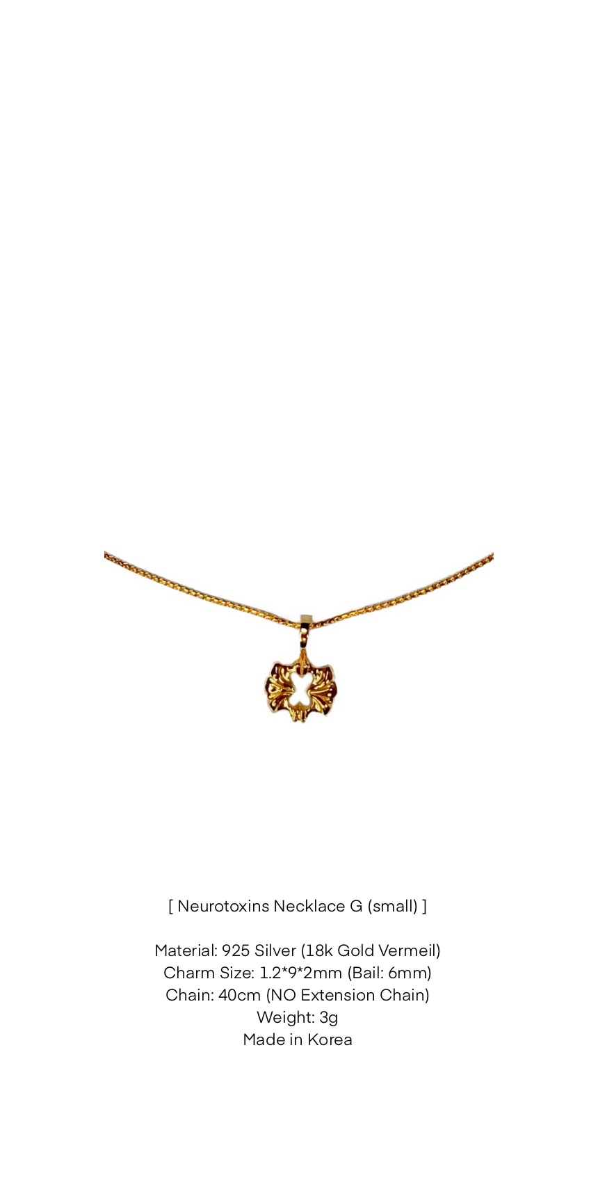 A necklace with a small pendant of Neurotoxins line signature shape. Handcrafted in 925 sterling silver and 18k gold plated. Produced in local factory located in Seoul, Republic of Korea.